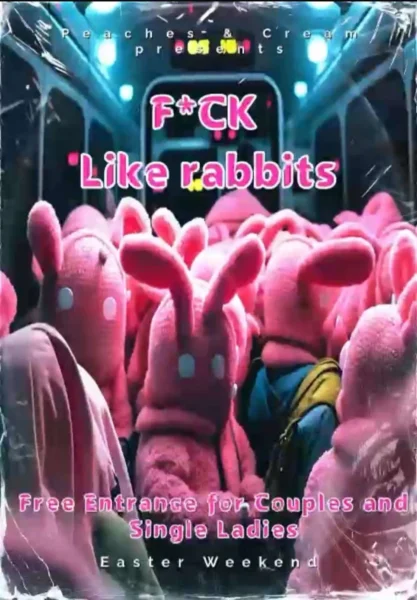 FOLLAR COMO CONEJOS 3 fiestas más de FIN DE SEMANA DE PASCUA están en camino, desde hoy sábado hasta el lunes. En esta época del año todo es sobre huevos de Pascua, conejos, … Entonces, ¿por qué no actuamos todos como conejos esta noche y FOLLAR como ellos? De hecho, similar al Sábado Santo de los últimos 3 años, les proponemos esta noche nuestra fiesta FOLLAR COMO CONEJOS. VEN y muéstranos tu peor / comportamiento más travieso y disfruta de una noche caliente con nosotros … Ven a festejar toda la noche, y si estás cansado, tenemos mucho espacio en la cama donde puedes FOLLAR unos minutos u horas … Ritmos de baile populares, un maravilloso AIRE ACONDICIONADO, bebidas frías servidas por camareros experimentados, y lo más importante: ¡gente caliente como tú y tú y TÚ! Entrada GRATIS para mujeres solteras y parejas (1 bebida por persona mínimo) Los hombres solteros respetuosos son bienvenidos, pero el equilibrio entre parejas y hombres solteros siempre se mantendrá. El registro en esta red NO garantiza la entrada al club. Las puertas abren a las 22:00 h. Esperamos verte de nuevo esta noche en el club de PDI. XXXX Tu equipo de ensueño Peaches & Cream