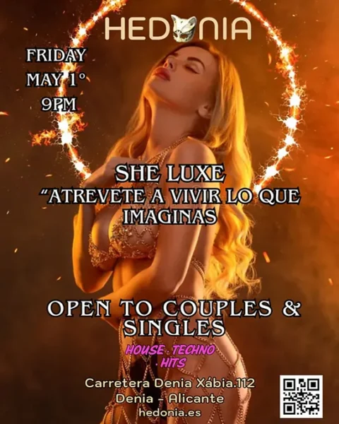 **She Luxe** es una noche para hombres, mujeres y **parejas curiosas y con fetiches de infidelidad** que no solo piensan en sus fantasías, sino que quieren experimentarlas. Aquí, no se trata solo de mirar. Aquí, sientes, experimentas y saboreas conscientemente la tensión entre miradas.
